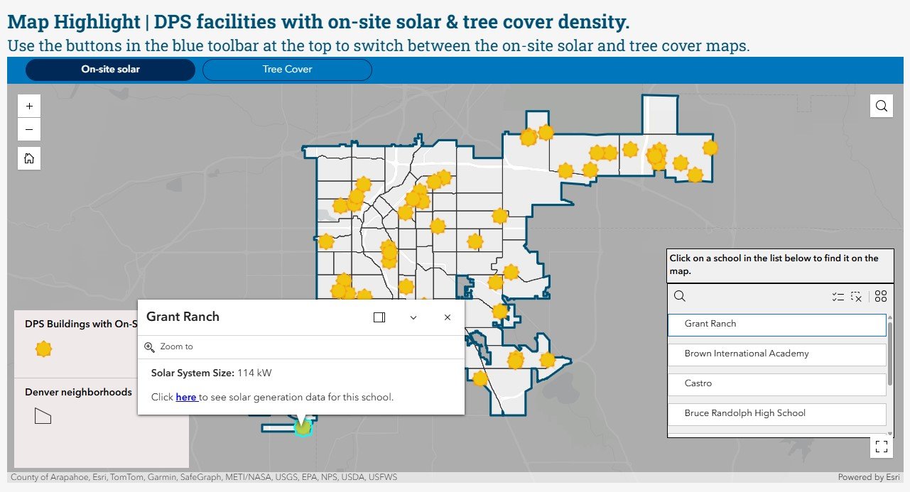 All embedded visualizations and maps are connected to centrally located datasets, enabling DPS sustainability staff to have ownership over their relevant metrics. This improves transparency to students, staff, parents, and the public; but also enables DPS staff to make informed program decisions. Visualizations were developed to be engaging and fun, allowing viewers to quickly understand key takeaways or dive deeper through other provided resources linked on each page.