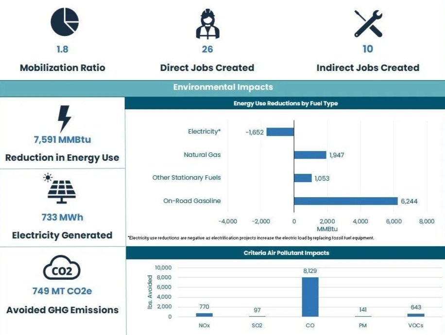 Sample program impact dashboard summarizing impacts of program implementation on energy use, emissions, air pollution, and jobs.